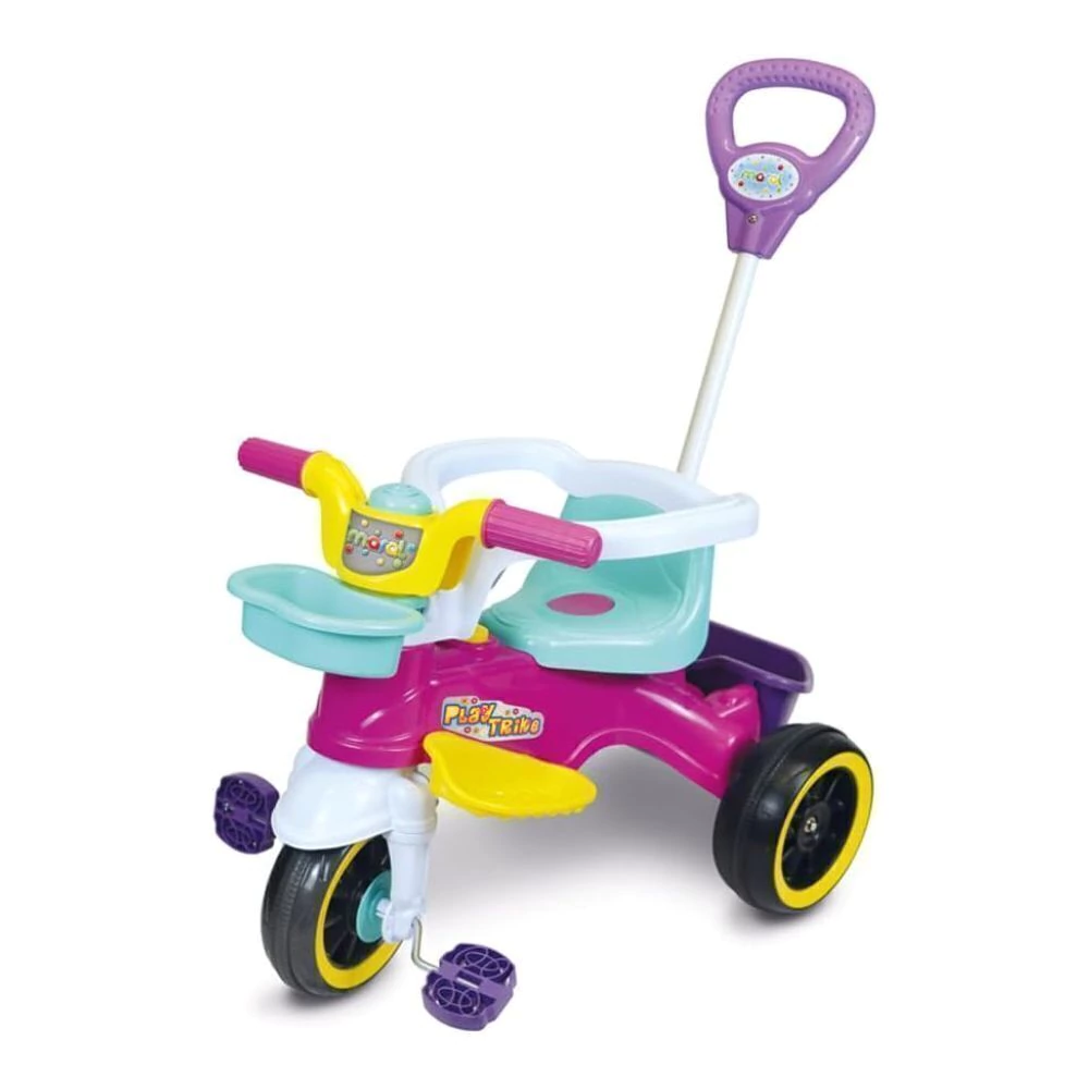 O Triciclo Infantil Play Trike Maral Rosa e ideal para acompanhar o crescimento das criancas, oferecendo modo passeio para criancas a partir de 12 meses e modo pedal a partir dos 24 meses. Com estrutura reforcada, eixo de metal e haste direcionavel, garante seguranca, estabilidade e facilidade no controle pelos pais. Possui dois porta-objetos e gancho traseiro para bolsa, alem de buzina funcional que incentiva a brincadeira criativa. Um triciclo completo, seguro e divertido, que une autonomia e diversao para os pequenos exploradores.